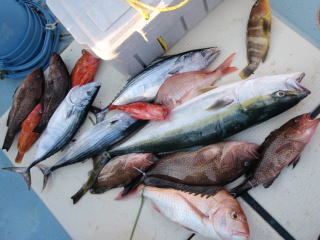 | 朝ちょっとシケてたけど昼前からベタ凪、快晴!!涼しくていいジギング日和です。 ハタも良型揃い。青物の良型バラシ、ラインブレイク度々。けっこう大漁です。 |