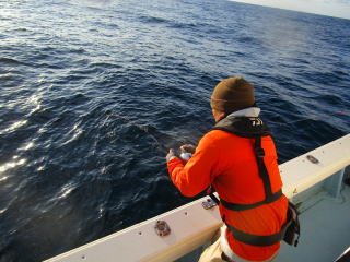 | 泳がせしたらすぐにヒット!! 膝に乗せてみました(^^)/ そんなに大きくなかったんですけどね…(^^;) |